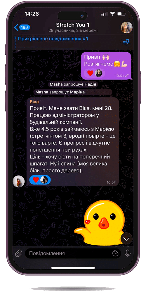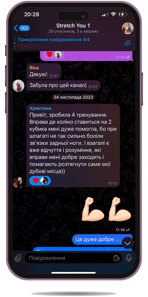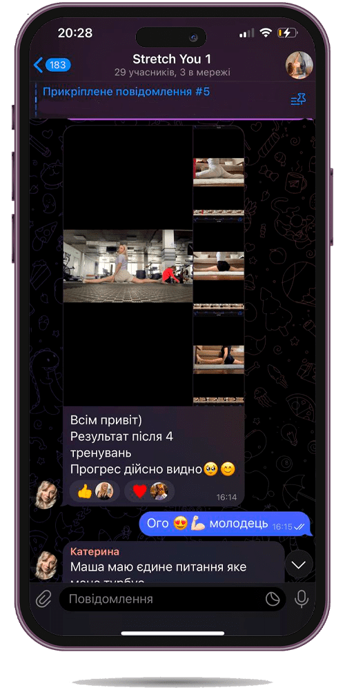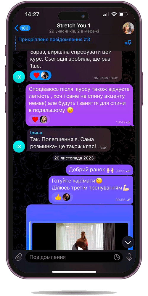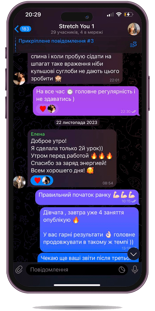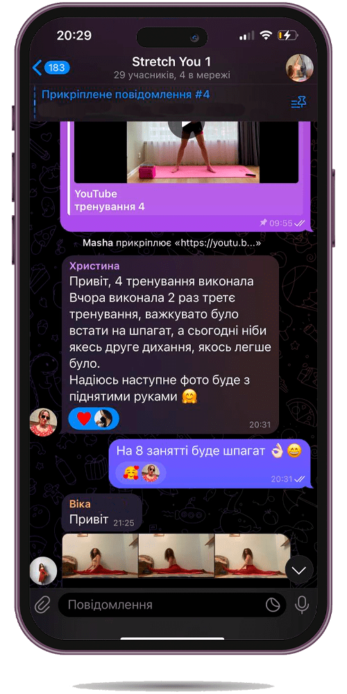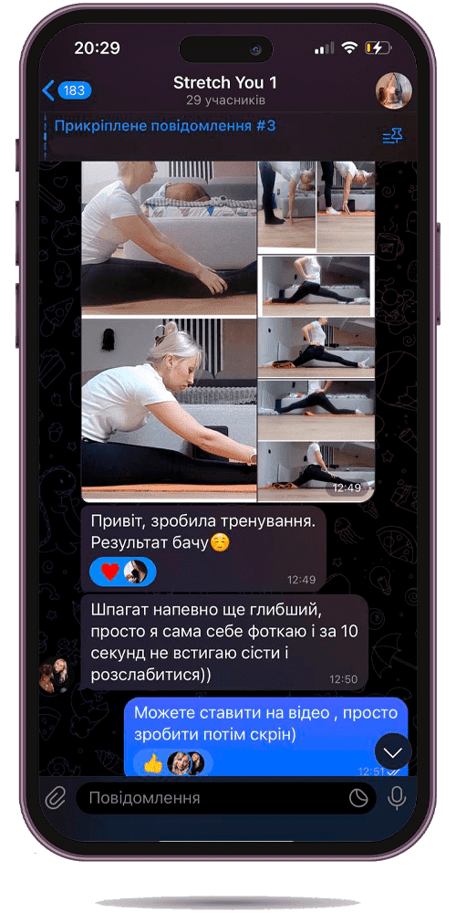 При придбанні курсу, надається доступ до закритого телеграм каналу із корисними порадами щодо стретчингу та домашніх тренувань.